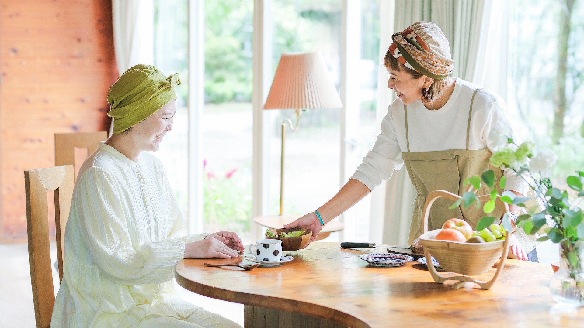 神奈川県 T様 現在薬投与の副作用で 髪の毛がなく、ウィッグが苦手なため 手編みの帽子を被っているのですが どうしても男っぽくなってしまい笑… 以前もスカーフハット… -
