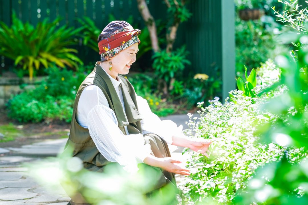 抗がん剤による大きな治療が終わってひと段落。髪が伸びてきてからも、日常のファッションアイテムとして活躍中。「髪が伸びてきた今も、結局いちばん落ち着くのはエミーキャップ」と笑顔で話してくれました。